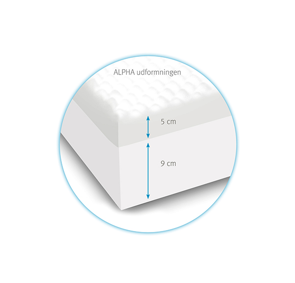 Begge skumtyper i høj kvalitet. Brugeren får ved anvendelse af Alpha skummadrassen en god følelse af, at kroppen bliver støttet, samtidig med at madrassen yder en forebyggende trykaflastende effekt.