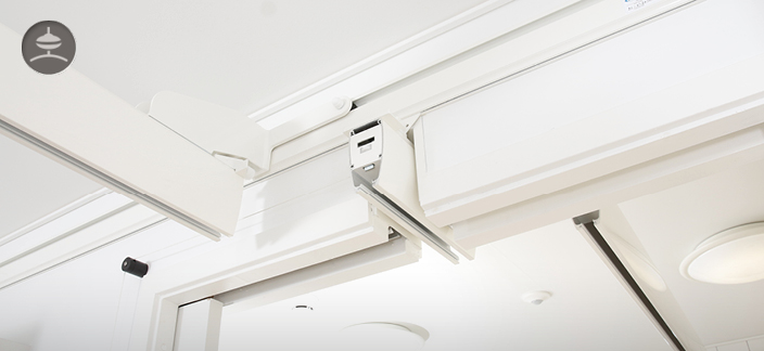 Patient transfer from room to room can be a very difficult task since most overhead track systems require under door transfer. Winncare has now introduced a unique door connector system for fast, easy, comfortable and, above all, safe transfers from room to room. This door connector does not require costly changes to the electrical system since it is totally manual in operation. Simply pulling on the operating cord opens the connection from the one system to the other. To lock, pull on the cord again to open the locking mechanism, and click the traverse into place.